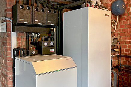 Valet föll på den modulerande luft/vatten-värmepumpen Biblock® WBB 12 och en WKS-kombiberedare, som består av en 300-liters Varmvattenberedare , en bufferttank och alla nödvändiga komponenter. Detta system krävde inte mer utrymme än det tidigare systemet.